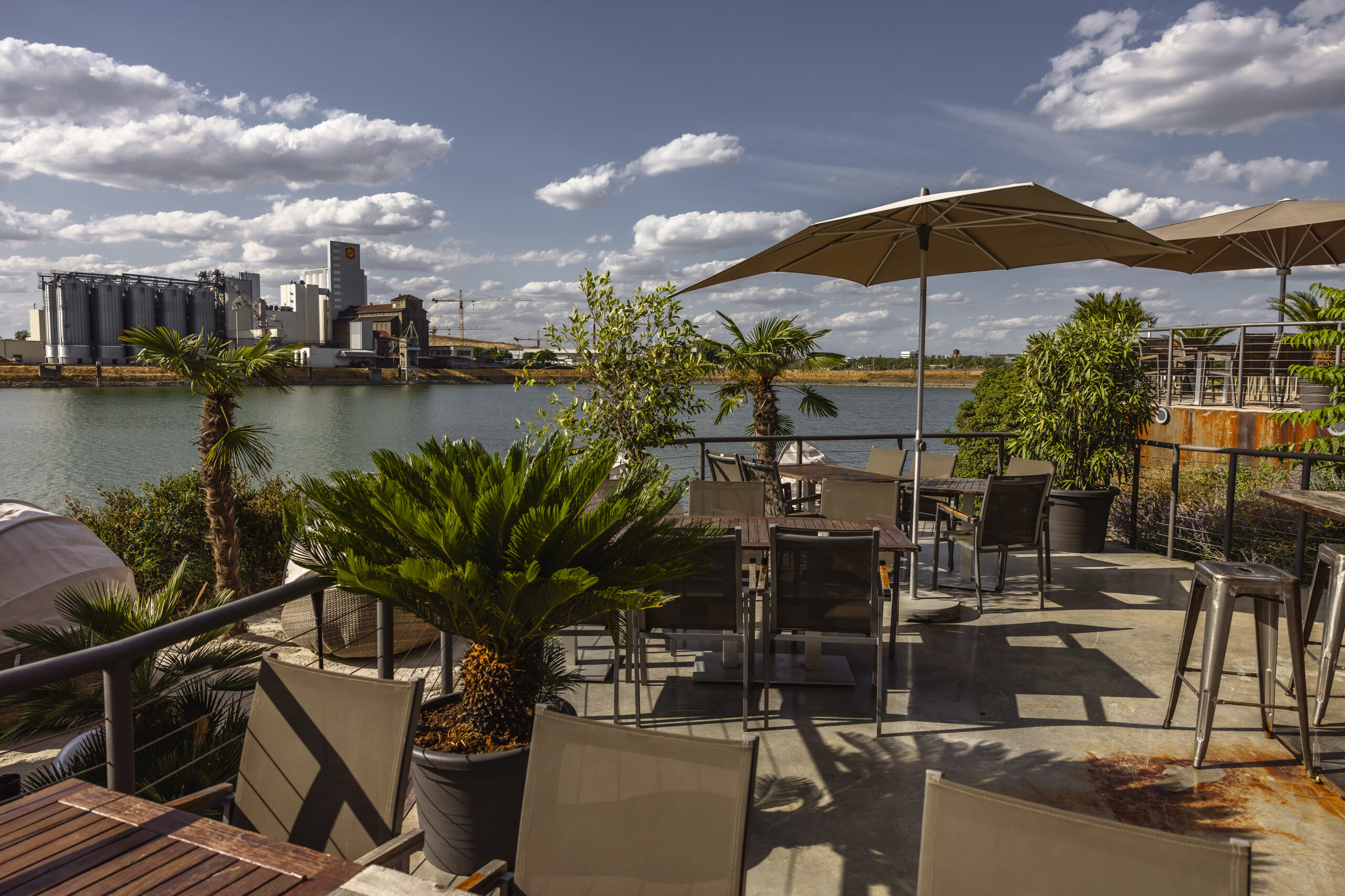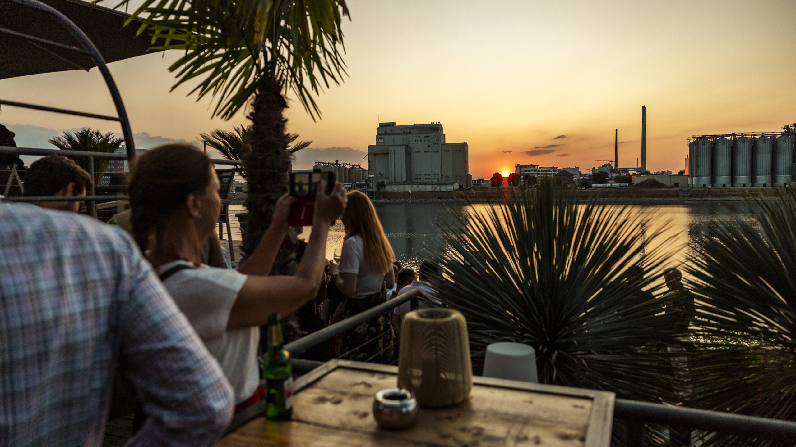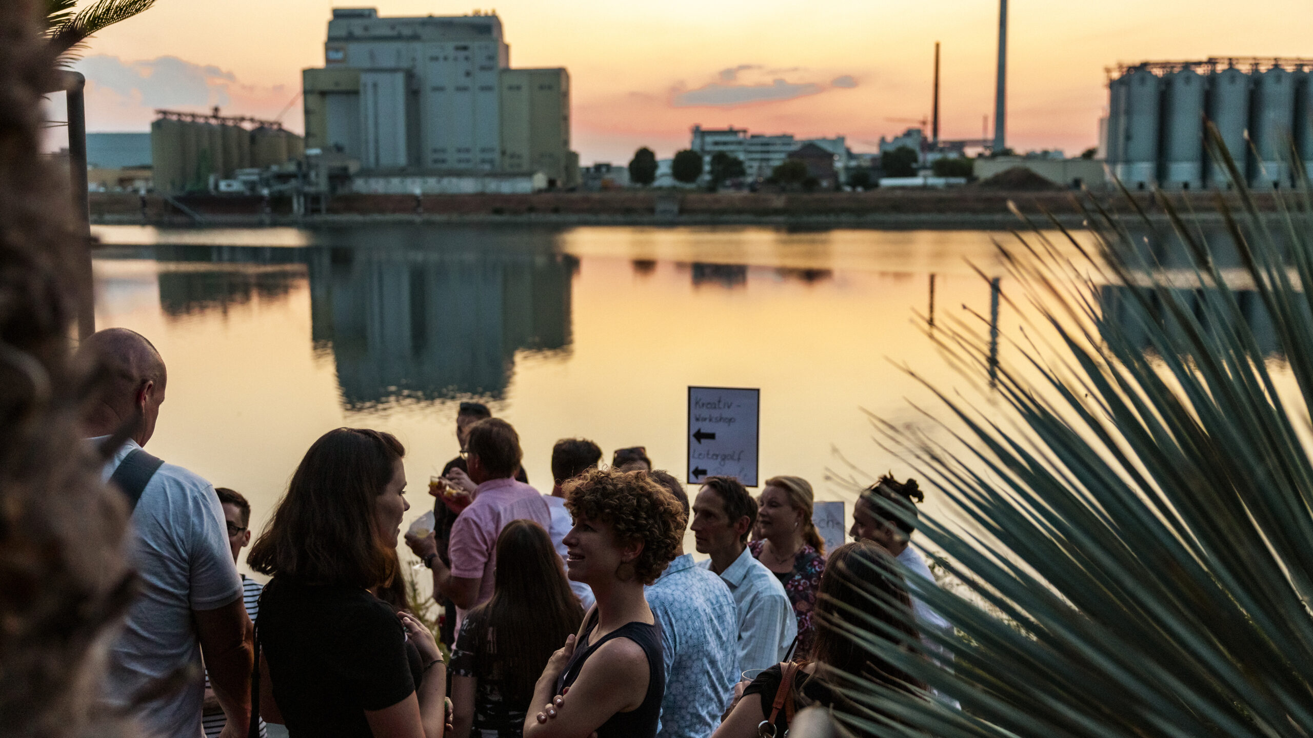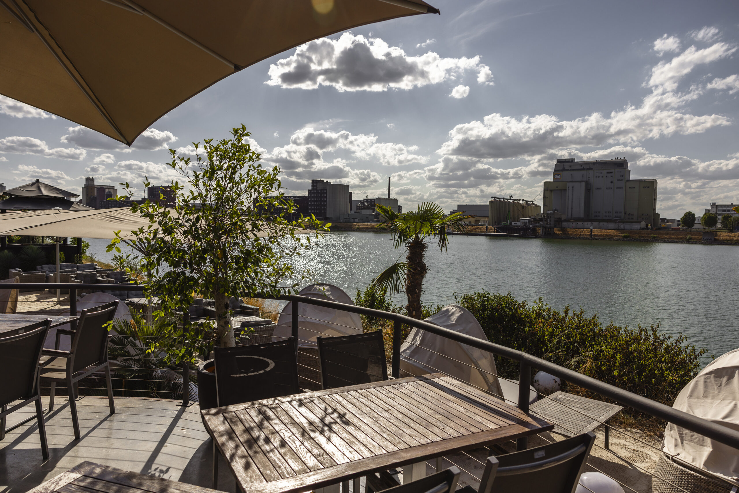 Unsere großzügige Sonnenterrasse direkt am Wasser bietet die perfekte Kulisse für unvergessliche Hochzeitsmomente unter freiem Himmel. Der Blick auf den Mannheimer Industriehafen, der sich am Abend in einem faszinierenden Lichterspiel zeigt, sorgt für eine Atmosphäre zwischen urbanem Flair und romantischer Leichtigkeit.